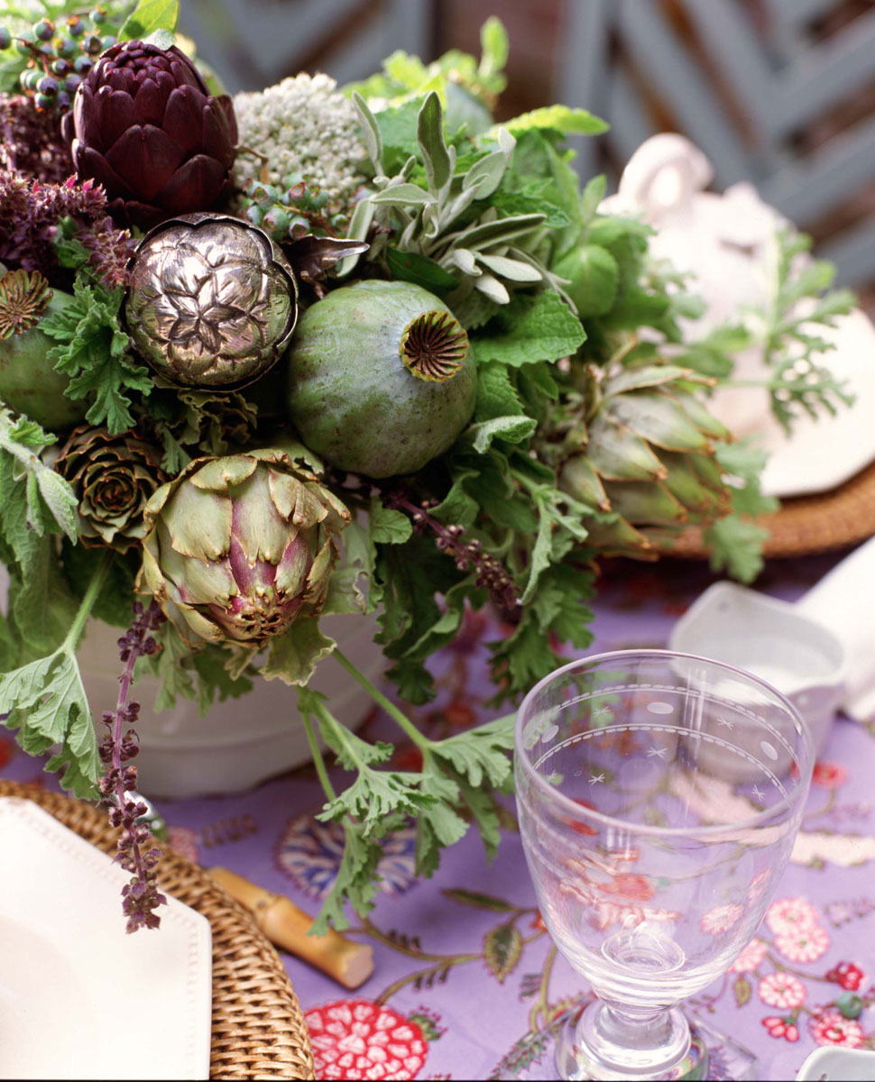 The goal of Charlotte Moss Entertains is to encourage people to come together, look forward to doing it and maybe experimenting a little with sprucing up. No expenditure required – just set the table – paper napkins, whatever you own, move a houseplant to the middle of the table or maybe a favorite large bowl filled with something seasonal; green apples, red cherries, ornamental kale, baby pumpkins, the possibilities are endless. The point is just do it… for your family, and yourself. (Below: from the supermarket and the pantry: vegetables punctuated with some of Charlotte’s silver vegetables)